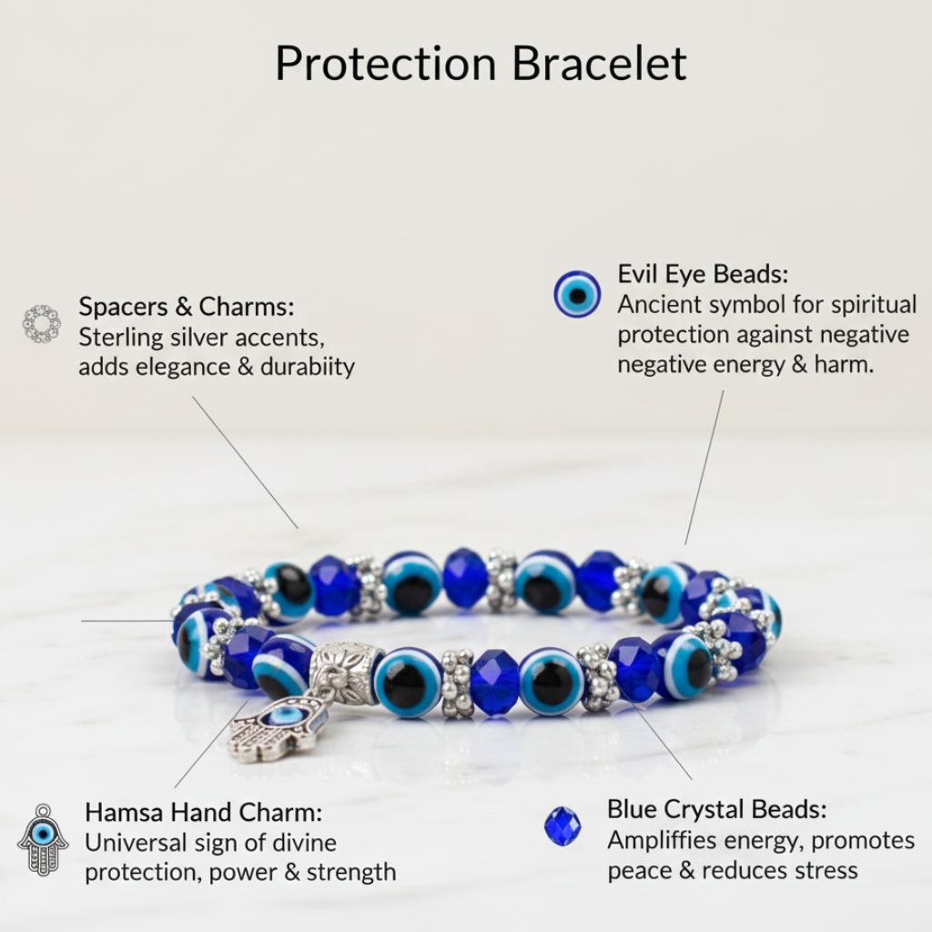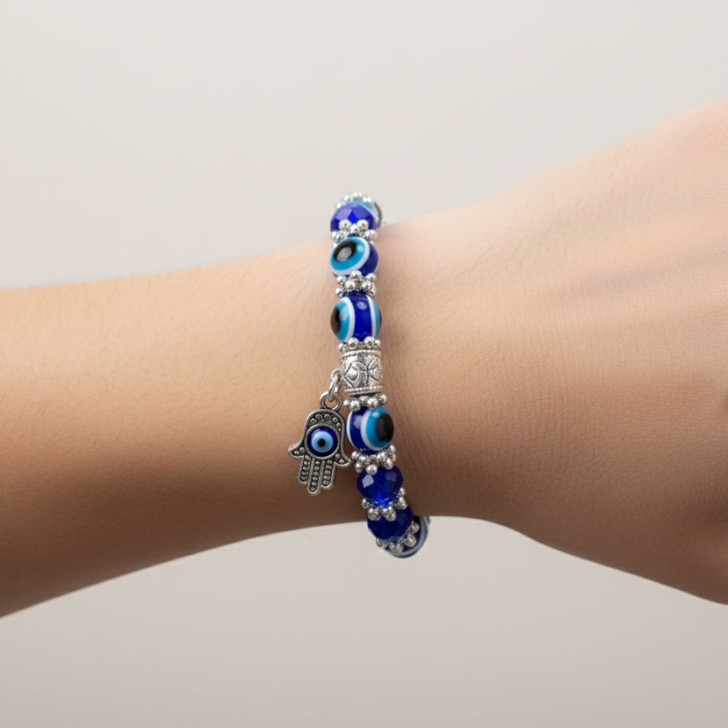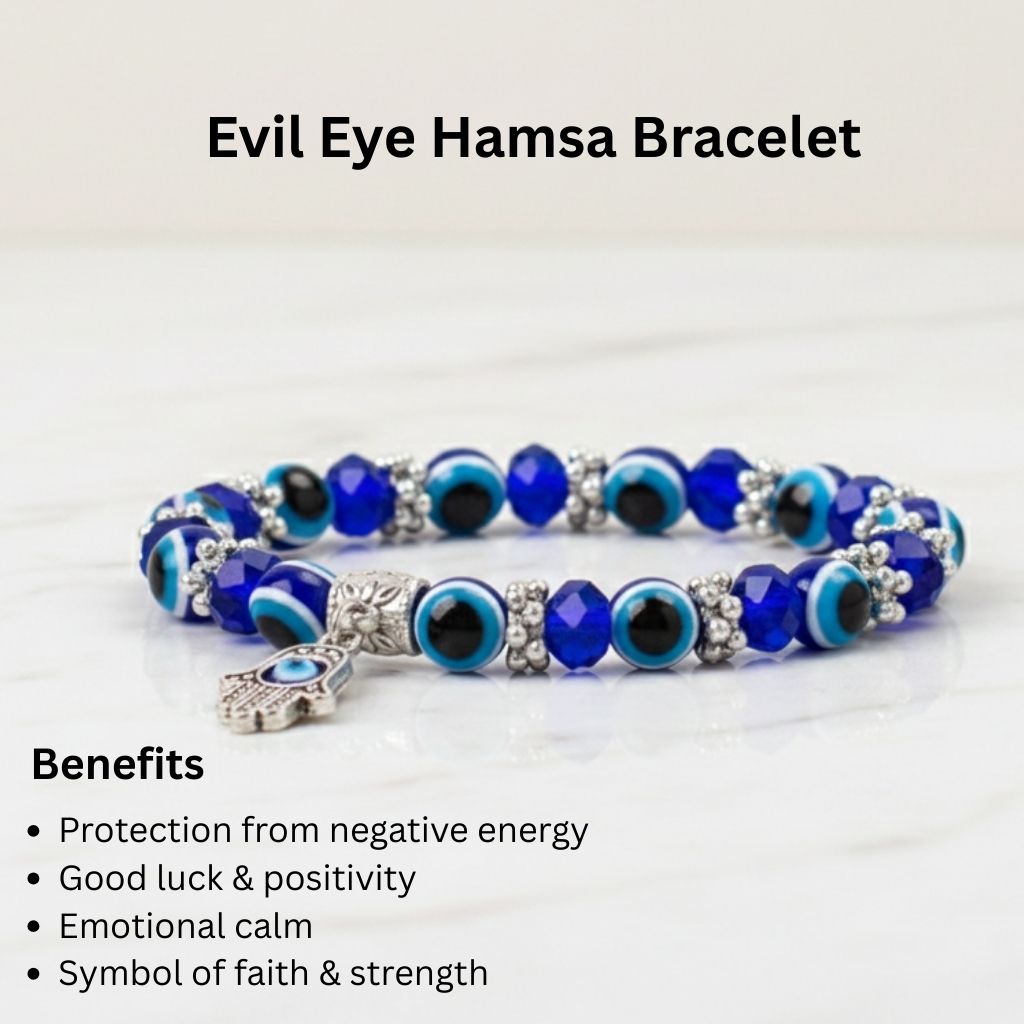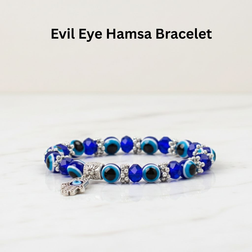 Evil Eye Hamsa Bracelet is designed to protect you from negative energy and bring good luck. Featuring the Hamsa hand and the Evil Eye symbol, this bracelet promotes positivity, shields against harm, and enhances confidence. Perfect for daily wear or as a meaningful gift.