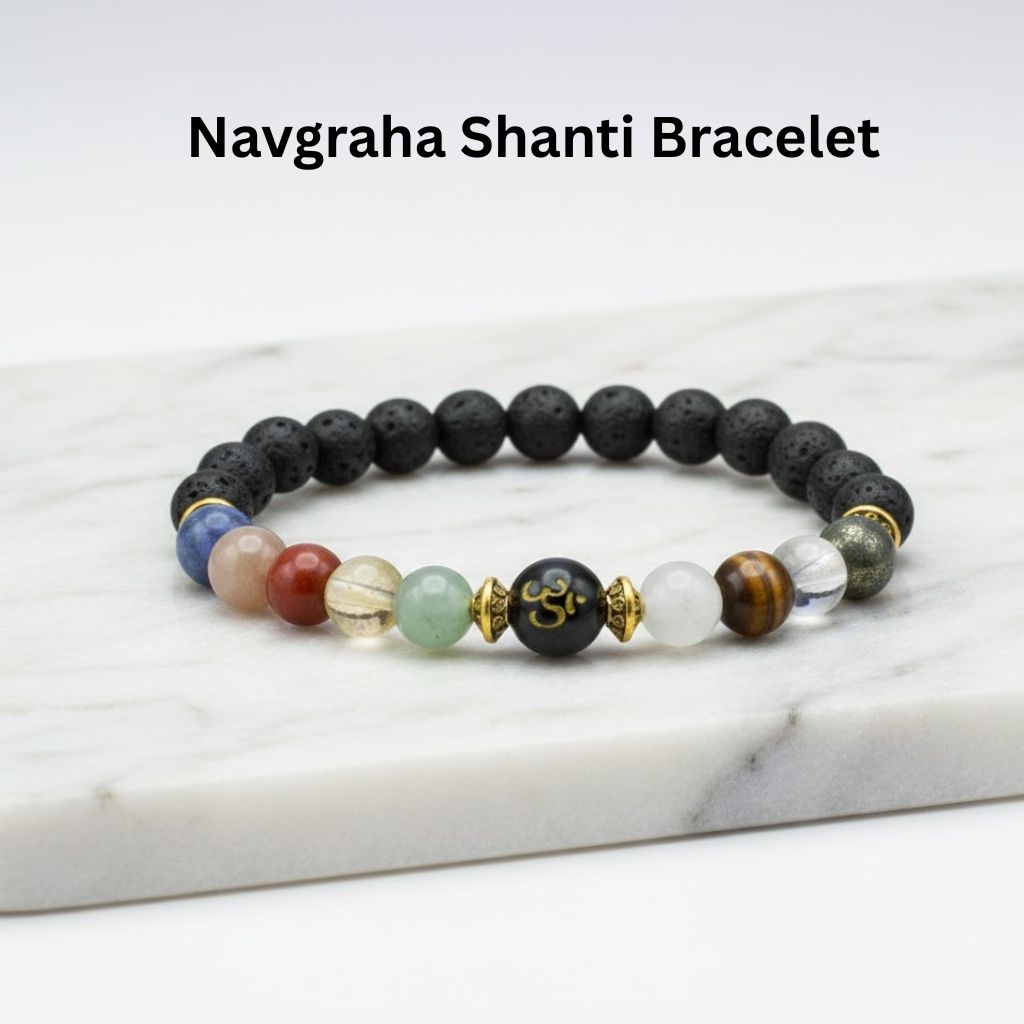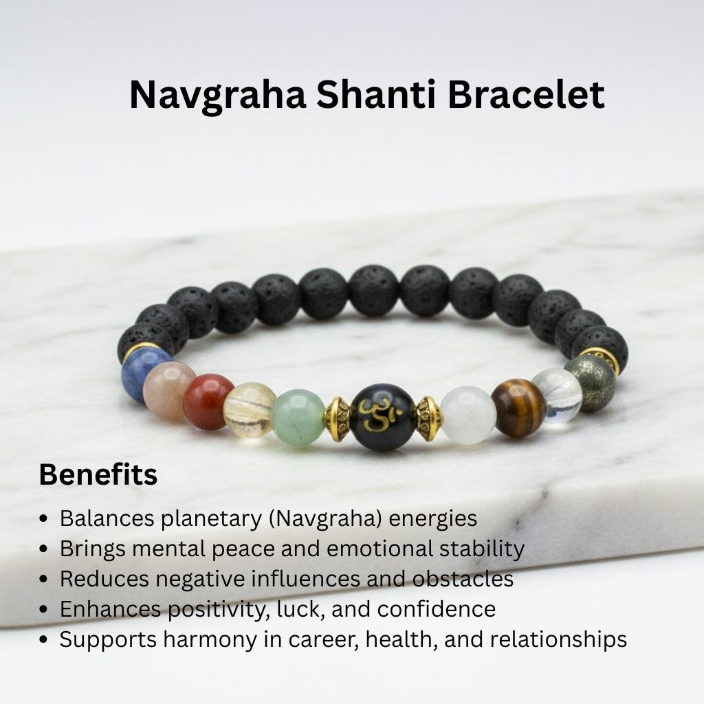 Navgraha Shanti Bracelet is crafted to balance the energies of the nine planets (Navgrahas) in your life. Made with natural gemstones, it helps reduce planetary doshas, promotes peace, and enhances overall well-being. Ideal for daily wear to invite harmony, positive energy, and protection.