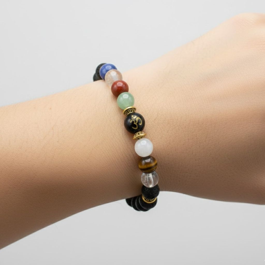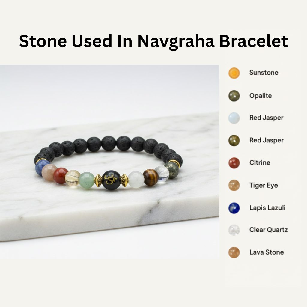 Attract money and balance all Navagrahas. This Navgraha bracelet combines the power of 9 gemstones for all 9 planets (Sunstone, Moonstone, Red Jasper, Green Aventurine, Citrine, Clear Quartz, Pyrite, Lapis Lazuli, Tiger Eye), lava beads, and an Om bead for ultimate peace and balance.