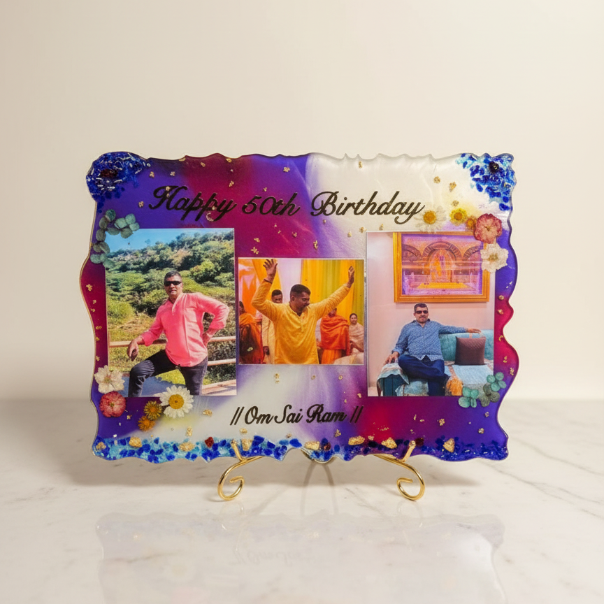 This personalized resin photo frame is handcrafted with vibrant colors, floral elements, and elegant gold detailing. Perfect for showcasing special memories, it makes a meaningful gift for milestone birthdays and celebrations.